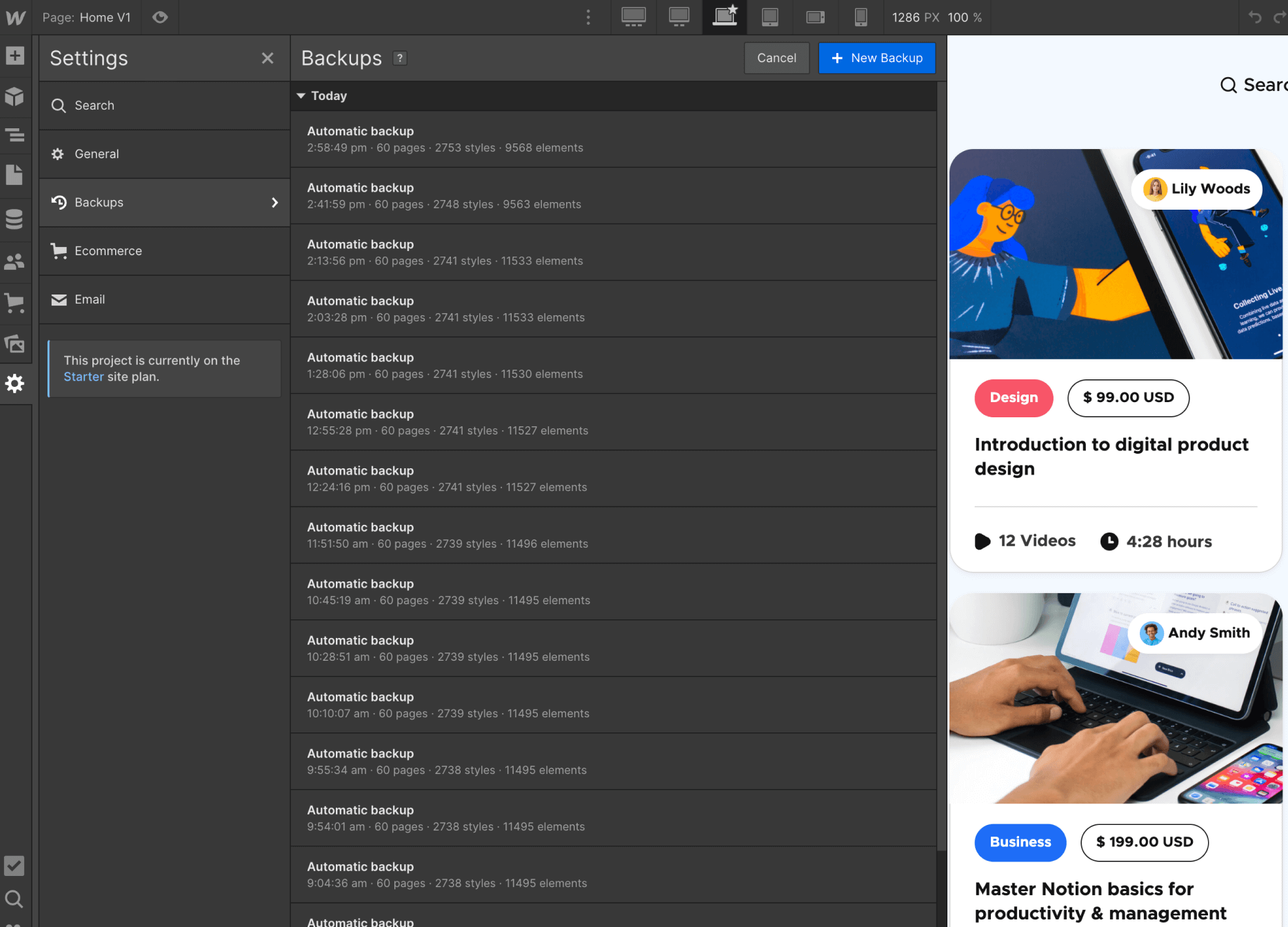If something goes wrong, for example, if you are not liking where the website is going to, if you deleted some critical classes that were required to make the Template look nice, or if you just want to go to a previous version for any reason, you can always go to the Backups section.